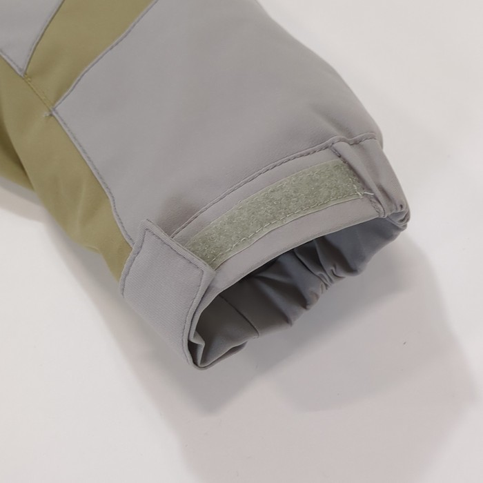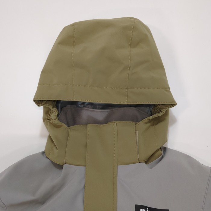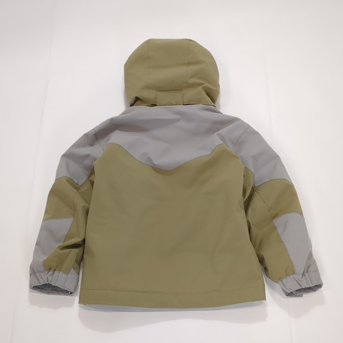 アウトドアテイストの上下セットのスキーウェアです。ジャケットとパンツの内側にそれぞれサイズ調整ひもがついており、約15~20cmの長さ調整が可能です。フードは着脱が可能。中綿入りです。首元には起毛トリコットを使用しています。耐水圧10,000mm。